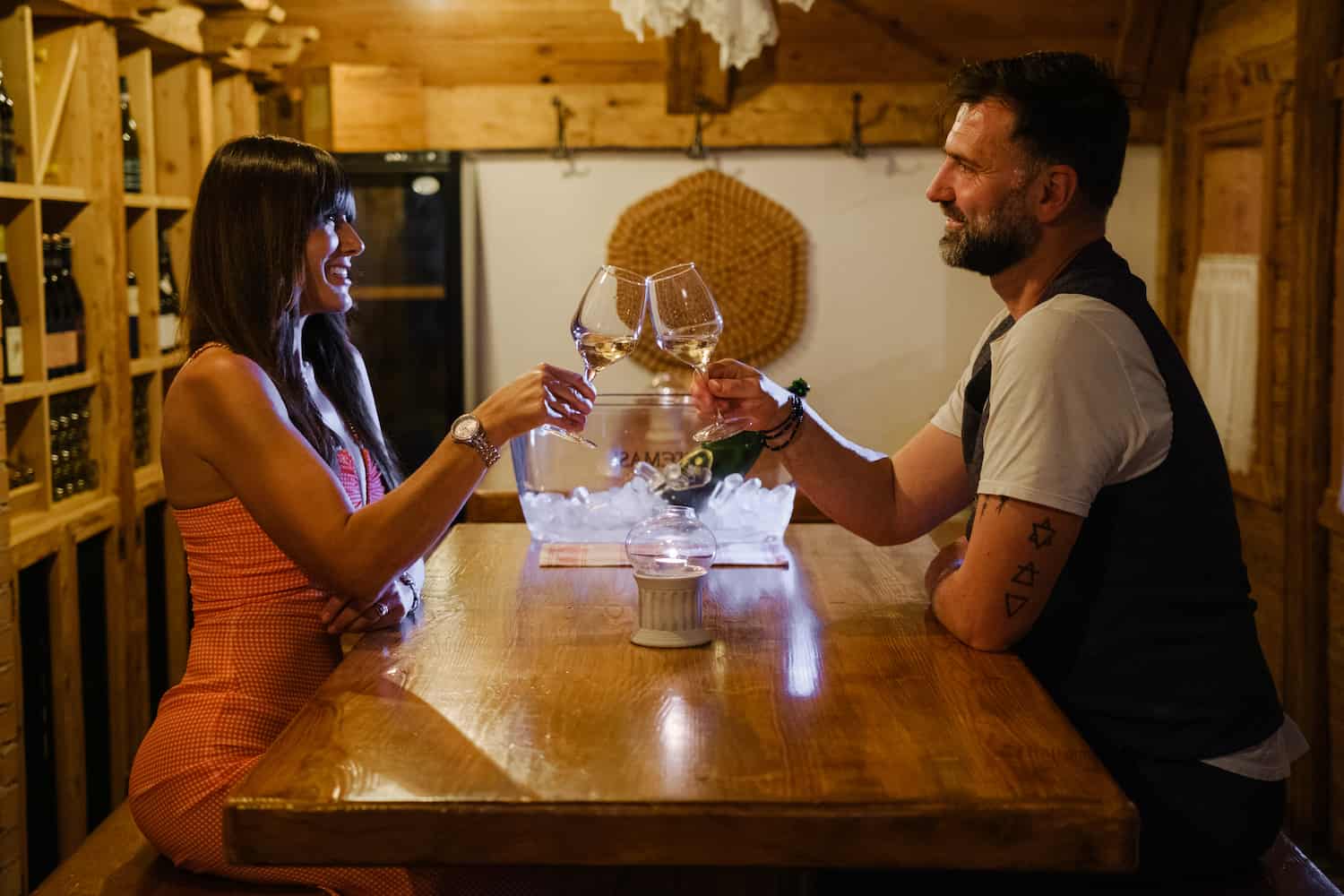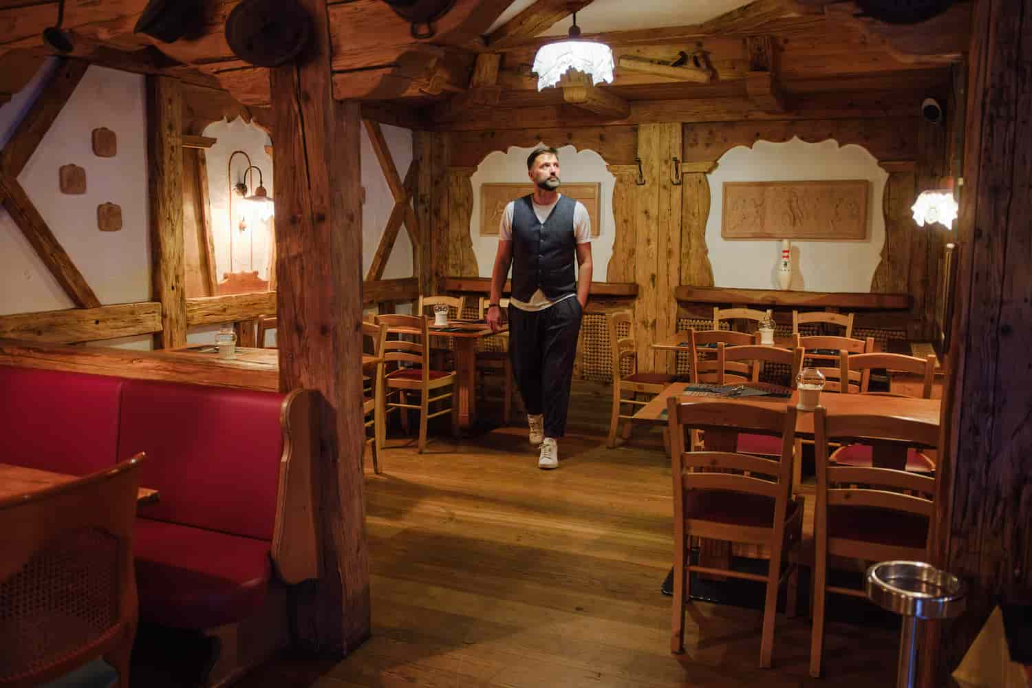 Die Caneva im Sartori’s Hotel, mit ihrer warmen Einrichtung aus Zirbenholz, ist ein ungezwungener Treffpunkt für gesellige Abende mit Musik und entspannter Atmosphäre.